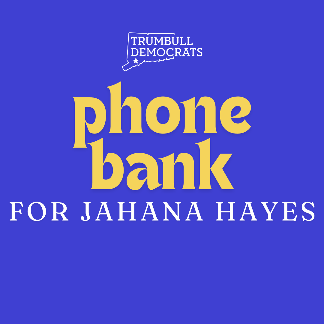 Phone Bank for Jahana Hayes Tuesday, September 24, 2024 6:00 PM 8:00 PM Trumbull Democrats HQ 6515 Main Street, 2nd floor Trumbull, CT 06611 (map) Google Calendar ICS Come to the Trumbull Dem's HQ to phonebank for Connecticut's Jahana Hayes to make sure we re-elect this valuable member of Congress. Please bring your phone, laptop if possible, and charger. Register in advance HERE or just come on by!